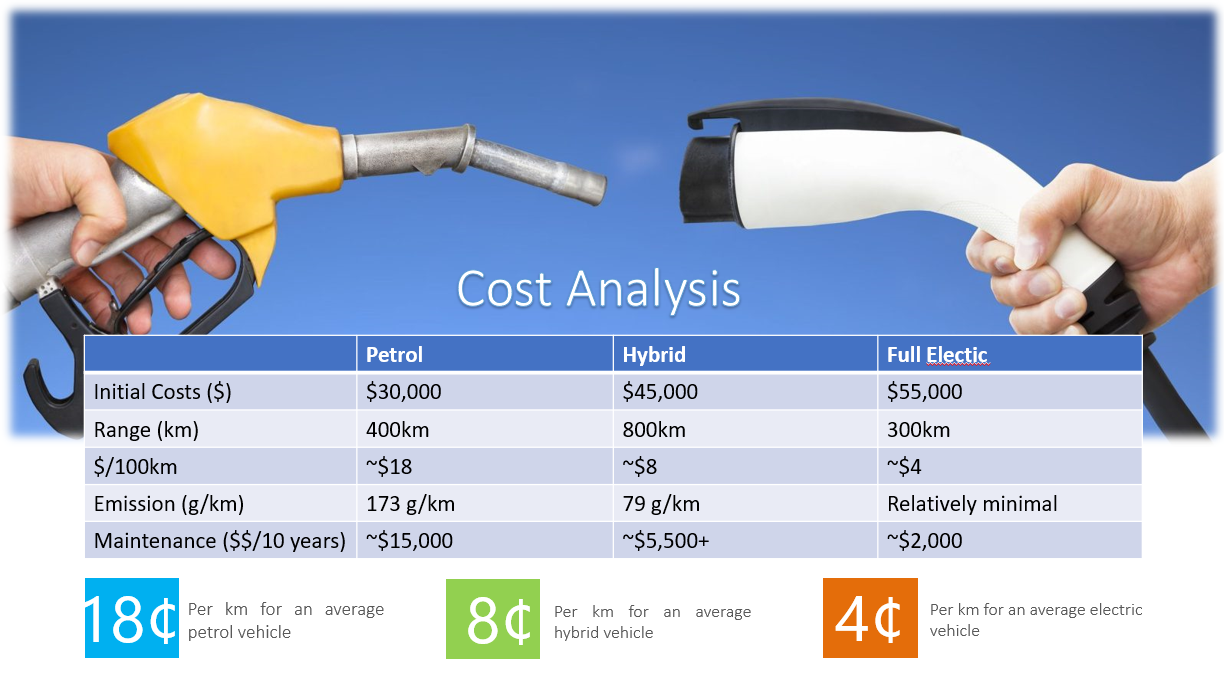 Refuelling an EV can cost as low as 4 cents per kilometer as opposed to 18 cents in a petrol car. Maintenance costs are also significantly lower as EVs contains fewer moving parts thus less frequent servicing is required.
