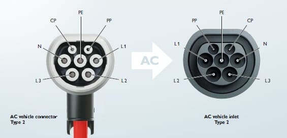 Type 2 connectors were originally designed in Germany in 2009 and have since become mandated in the European Union. They were designed to replace J1772 plugs and have since become the worlds leading form of Electric Vehicle connector. Current generation type 2 connectors can charge at 120kW making them essentially as fast as filling your vehicle up with conventional petrol. The connector has 7 pins which control the car’s charging: