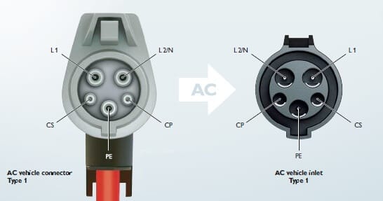 Type 1 connector leads were originally designed by the California Air Resources Board in 2001 becoming the predominate connector in North America and Japan. The maximum power delivered by this cable is 19.2kW. from 80A circuit and 240V which was adopted in 2009 by the major US and Japanese Automakers. The 5 pin connector: